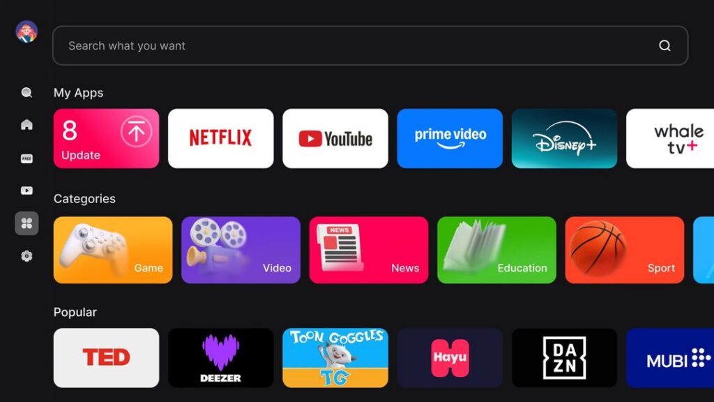 Günümüzün sonsuz izleme seçenekleri karşısında bunalmak çok kolay. İşte bu yüzden SMART WHALE TV, tüketicilerin bu eğlence denizinde gezinmesine yardımcı olmak için tasarlandı. Dahili evrensel arama ve yapay zeka destekli öneri motoru, saniyeler içinde izlenecek yeni içerikler bulmanıza yardımcı olur.